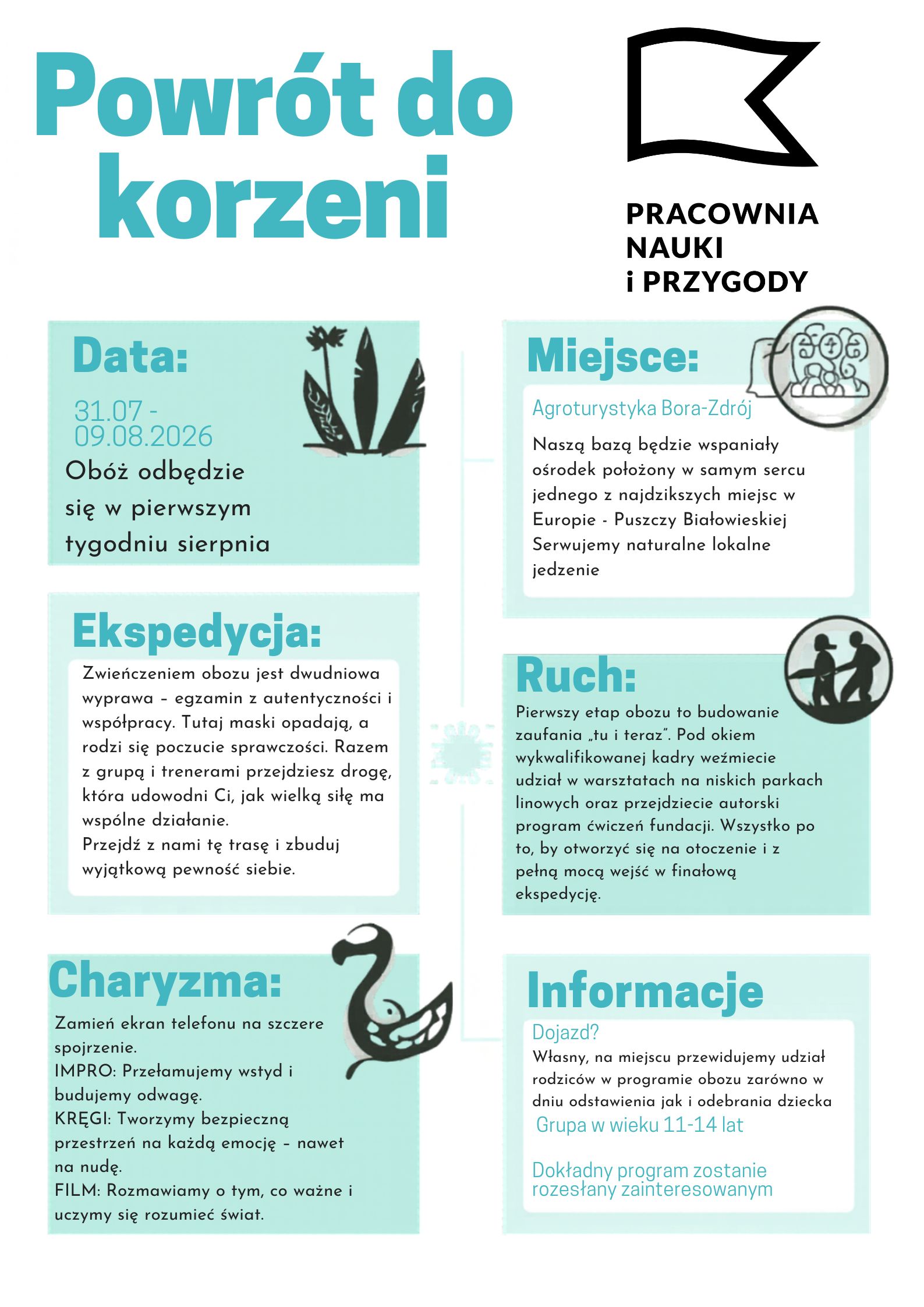 Zależy nam na przeprowadzeniu Twojego dziecka przez formujący proces grupowy, w którym będzie miało szansę zaznać prawdziwej przyjaźni, współodpowiedzialności w grupie i uczenia się bycia poza swoją strefą komfortu. Wszystko to w otoczeniu pięknej podlaskiej przyrody.